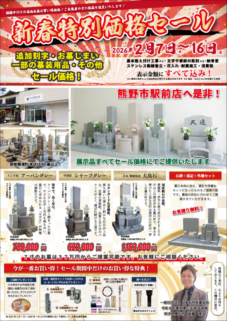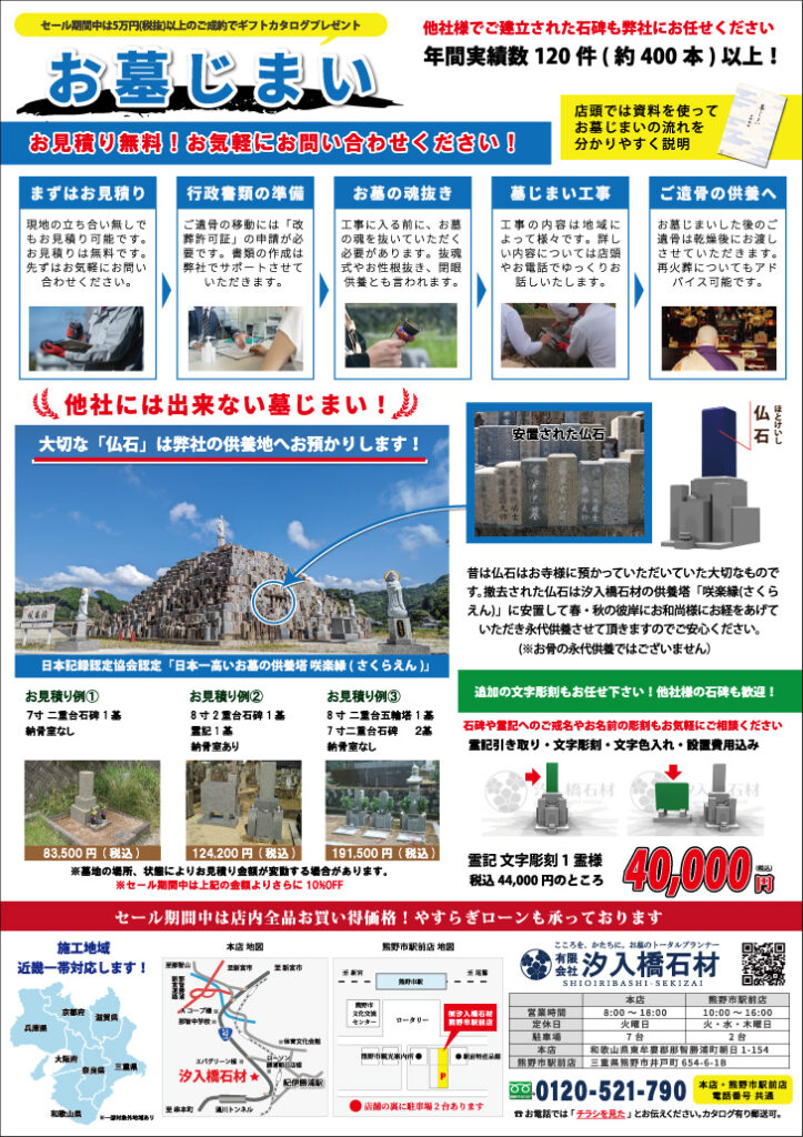 昨今、様々な事情によりお墓を片付ける必要が出てきております。汐入橋石材は那智勝浦町内に自社で供養地を設けることにより、他社様や他の石材店様には真似できないサービスをご提案させていただいております。