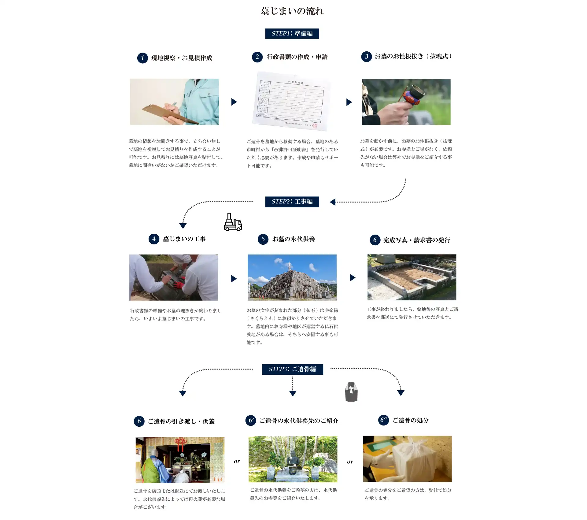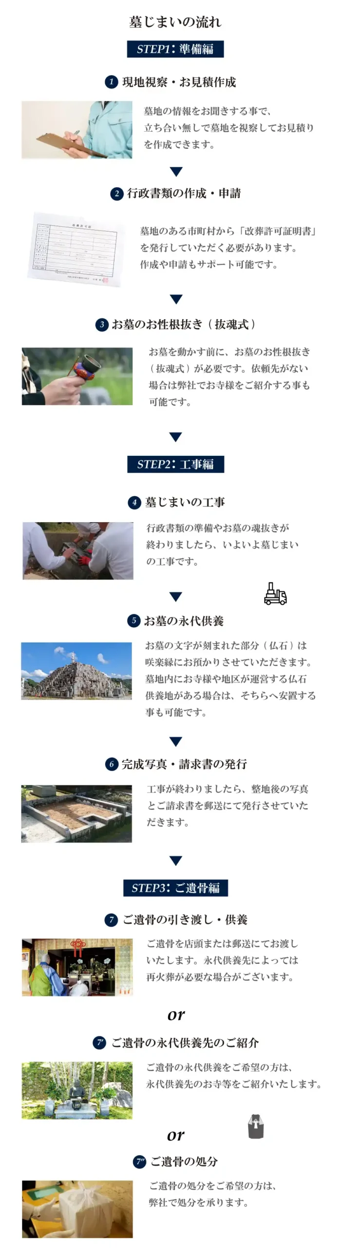 現地にて墓地を視察後、お見積りを作成して書類を郵送させて頂きます。お見積りは無料ですのでお気軽にお問い合わせください。お見積り後、お墓じまいのお申し込みはお電話またはご来店のどちらでもかまいません。お気軽にご連絡ください。
