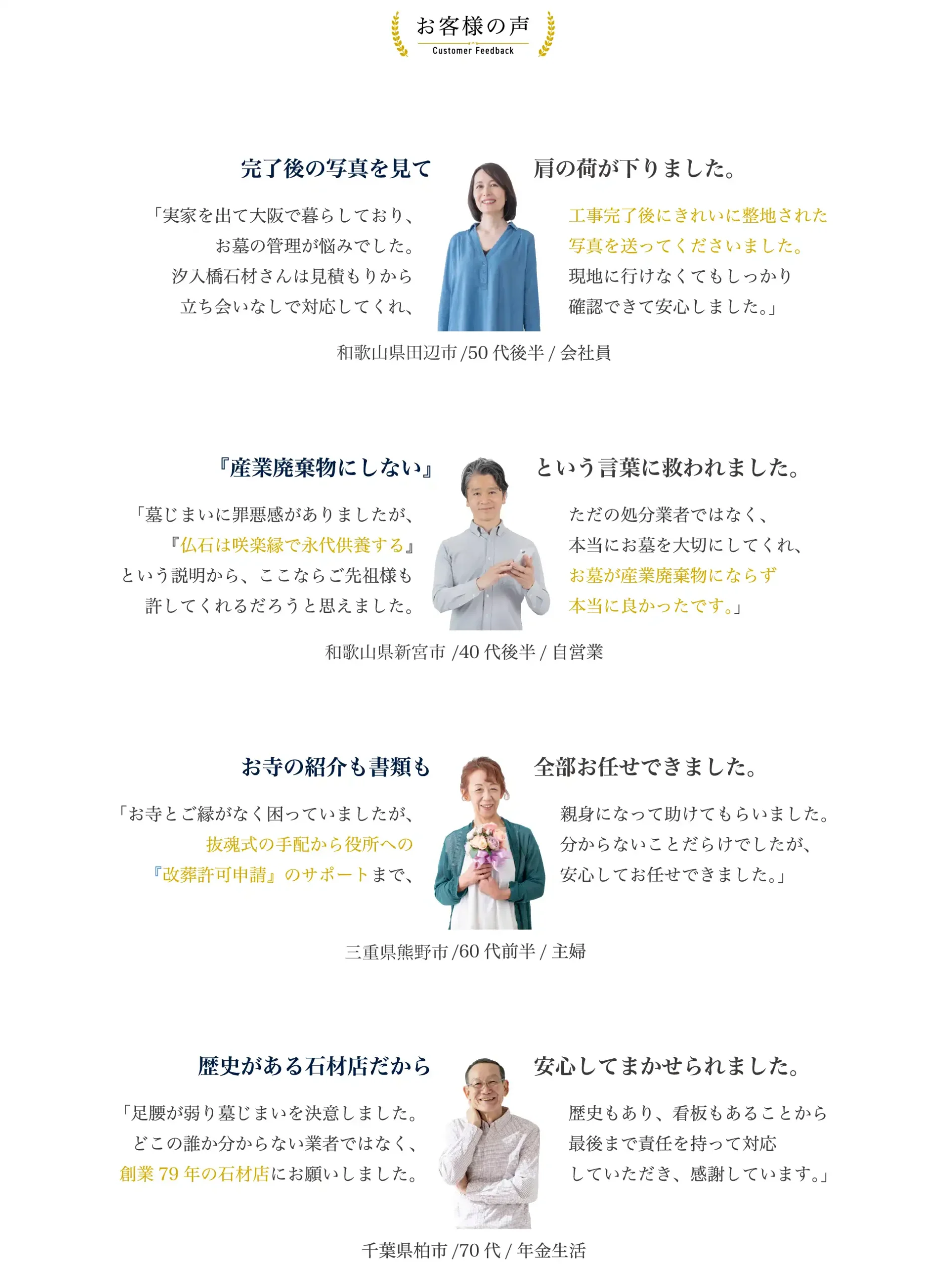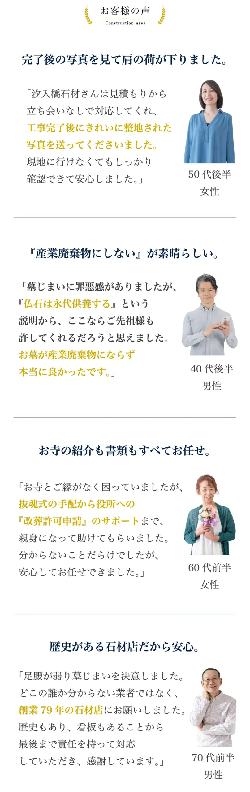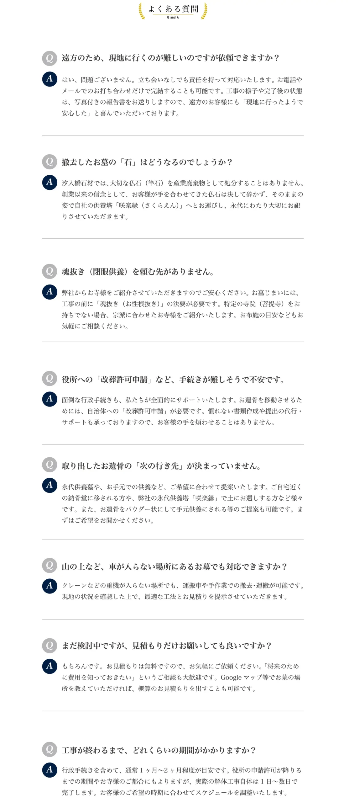 建てた責任はもちろん、しまう責任も、私たちが背負います。 大切な石も、ご先祖様への想いも、私たちが最後まで守り抜きます。どうぞ、罪悪感を持たずにご相談ください。